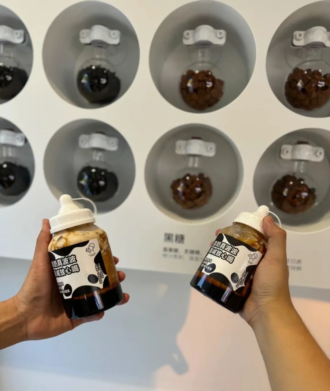 在外觀上,門店整體采用黑白兩色設(shè)計(jì),與真牛乳的主題結(jié)合。為了吸引顧客,喜茶推出了奶瓶設(shè)計(jì)的產(chǎn)品,門口也陳列了超大號(hào)牛奶瓶。值得注意的是,該店與主流的喜茶門店相比,這家奶茶店的面積較小,只有十幾平米,店內(nèi)不設(shè)堂食,主要是自提和外送。門店除了點(diǎn)單區(qū)和后廚,還在左側(cè)設(shè)置了原料展示區(qū),展示波波、黑糖等食材。