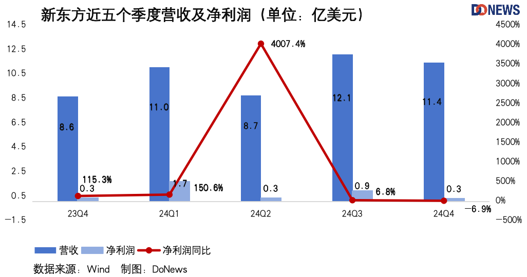 財報顯示,2024財年第四季度新東方凈營收同比增長32.1%,達11.367億美元(約88.6億港元);股東應占凈利潤同比下跌6.9%至2700萬美元(約2.1億港元);經(jīng)營利潤為1050萬美元(約8186萬港元),同比下降78.1%;經(jīng)營利潤率為0.9%,上一財年同期為5.6%。