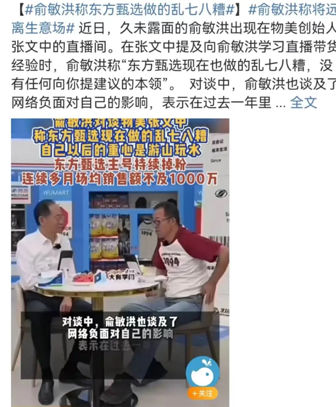 6月初時,俞敏洪曾在物美創(chuàng)始人張文中的直播間中表示過東方甄選做的亂七八糟,主號持續(xù)掉粉,連續(xù)多月場均銷售不及1000萬。