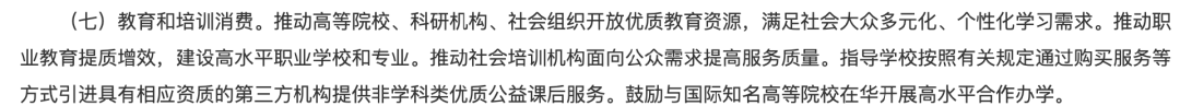 但要注意的是,文件中強調(diào)的是推動開放優(yōu)質(zhì)教育資源、職業(yè)教育提質(zhì)增效、建設高水平職業(yè)學校和專業(yè)以及引進具有相應資質(zhì)的第三方機構(gòu)提供非學科類優(yōu)質(zhì)公益課后服務,這并不等同于校外培訓。