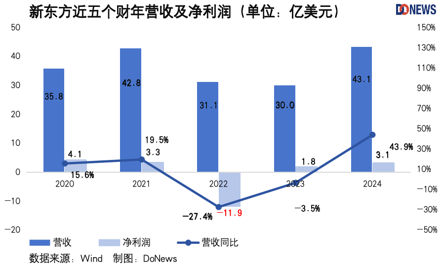 如果回看過去五個財年,2024財年新東方已經(jīng)恢復到2021年的財務水平,凈營收43.14億美元(約336.3億港元),同比上升43.9%;股東應占凈利潤同比上升74.6%至3.1億美元(約24.1億港元);經(jīng)營利潤上升84.4%至3.5億美元(約27.3億港元);經(jīng)營利潤率為8.1%,而上一財年同期為6.3%。截至2024年5月31日止,新東方的現(xiàn)金和現(xiàn)金等價物為13.9億美元(約108億港元)。