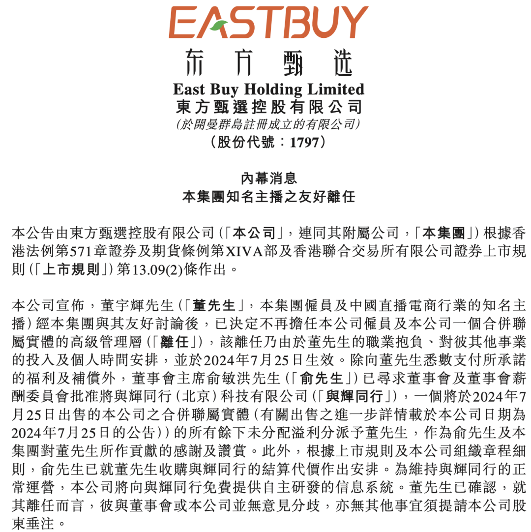 事情過去半年多,雙方選擇了“分手”。7月25日,東方甄選(1797.HK)公告董宇輝離職,東方甄選全資子公司與輝同行正式從東方甄選獨立出去。