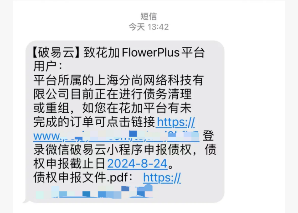 據(jù)多家媒體報(bào)道,有消費(fèi)者已收到“破易云”平臺(tái)發(fā)送的通知,確認(rèn)上海分尚網(wǎng)絡(luò)科技有限公司(即花加)正在進(jìn)行債務(wù)清理或重組。