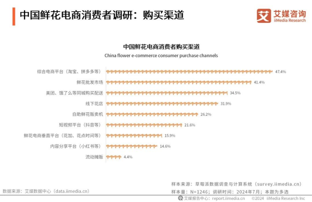 根據(jù)艾媒咨詢(xún)發(fā)布的《2024-2025年中國(guó)鮮花電商市場(chǎng)分析報(bào)告》,47.4%的受訪消費(fèi)者選擇在綜合電商平臺(tái)買(mǎi)花,而從花加、花點(diǎn)時(shí)間等鮮花電商僅占15.9%。