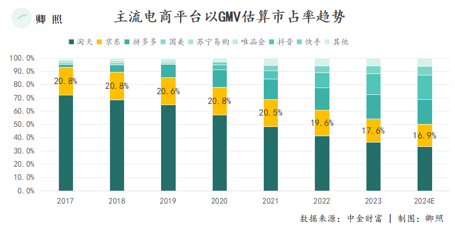 比上,淘天2023年以36.5%的市占率仍盤(pán)踞第一,短期內(nèi)不會(huì)交棒他人;比下,拼多多的成長(zhǎng)速度唯有恐怖二字。往后看,直播電商領(lǐng)頭羊抖音虎視眈眈,眼看也要在今年沖擊第三名位置。