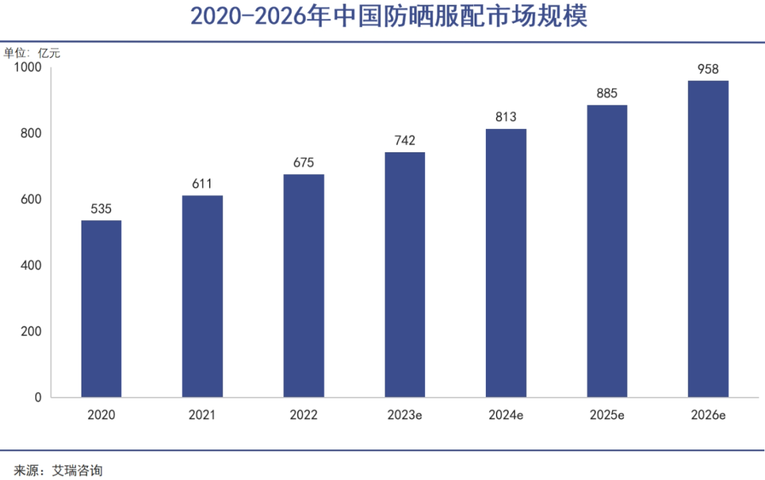 近幾年,我國(guó)防曬服市場(chǎng)規(guī)模持續(xù)增長(zhǎng),2023年市場(chǎng)規(guī)模達(dá)到742億元,預(yù)計(jì)2026年將達(dá)到958億元,三年復(fù)合增長(zhǎng)接近9%,即將邁向千億級(jí)大市場(chǎng)。