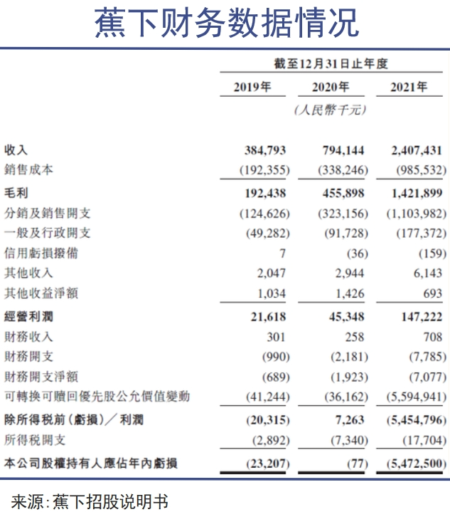 在KOL的造勢(shì)與明星代言影響力加持下,蕉下產(chǎn)品與品牌聲量持續(xù)爆炸,但出色的營(yíng)銷能力換回來(lái)的實(shí)際利潤(rùn)卻難以達(dá)到管理層的預(yù)期。2019-2021年,蕉下的毛利分別為1.9億元、4.6億元、14.2億元,而經(jīng)營(yíng)利潤(rùn)僅有2162萬(wàn)元、4535萬(wàn)元、1.47億元。