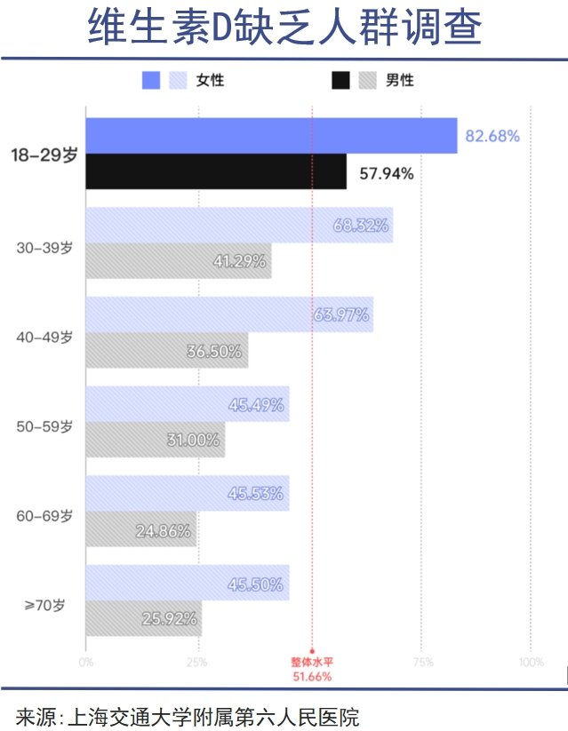 上海的一項(xiàng)醫(yī)學(xué)研究顯示,在兩萬(wàn)名調(diào)查對(duì)象中,有51.66%的人存在維生素D缺乏的問(wèn)題,35.20%維生素D不足。其中18~25歲青年維生素D缺乏率最高,女性占比高達(dá)82.6%,這一人群與防曬用品的最大用戶群體完全吻合。