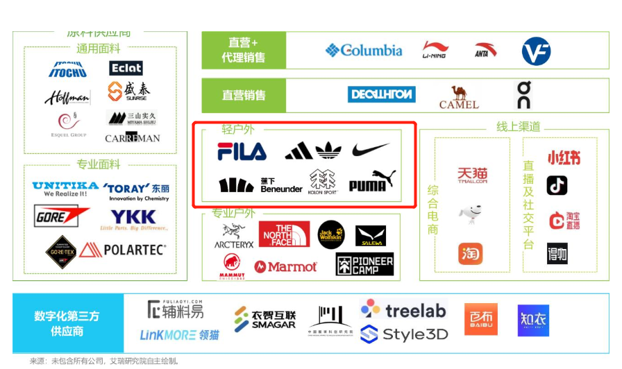 一方面,傳統(tǒng)戶外市場(chǎng)已經(jīng)有了明確的高中低端分野,高端如始祖鳥(niǎo)、猛犸象,中高端如哥倫比亞、北面、凱樂(lè)石,低端亦有駱駝、迪卡儂。