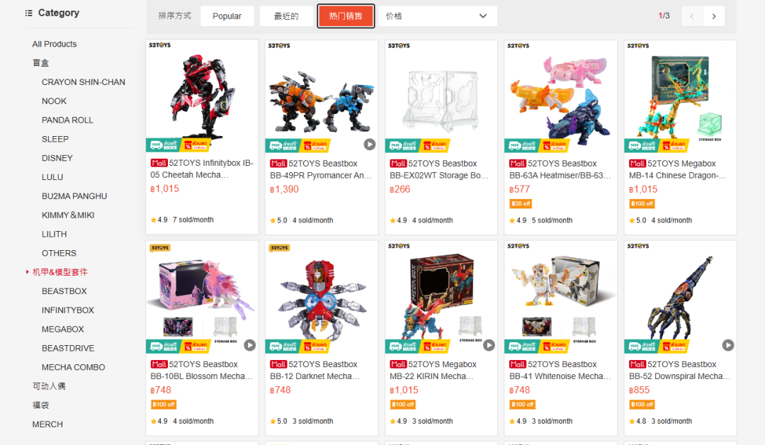 52TOYS Shoppe越南站官方旗艦店為機(jī)甲福袋、變形金剛組裝模型等多款產(chǎn)品,平臺顯示銷量不足100單。同樣的問題也出現(xiàn)在泰國市場,在52TOYS Shoppe泰國站官方旗艦店上,機(jī)甲變形系列月銷量普遍不足百單。