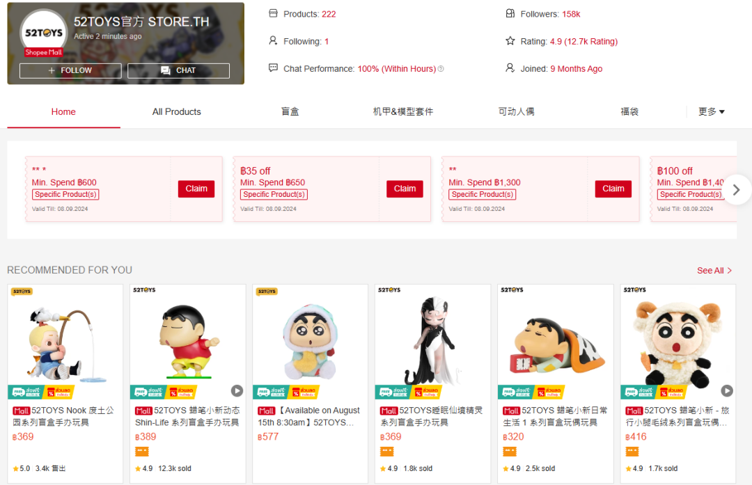 在52TOYS Shoppe泰國站官方旗艦店上,類似于蠟筆小新系列、睡眠夢境精靈等經(jīng)典IP衍生品月銷普遍在千單以上,蠟筆小新動態(tài) Shin-Life系列盲盒手月銷更是達(dá)到12.3K。