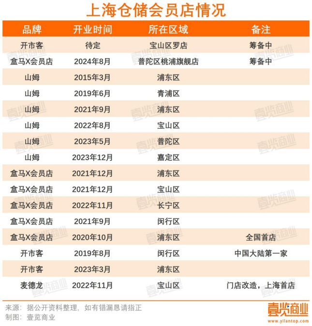 第四,來伊份倉儲會員店的“出生點”,選在了倉儲會員店競爭最激烈的上海。據(jù)壹覽商業(yè)不完全統(tǒng)計,截至2024年6月,上海至少有13家倉儲會員超市在營,2家倉儲會員超市正在籌建,1家倉儲會員超市正在改造。這意味著,上海至少有16家倉儲會員超市。