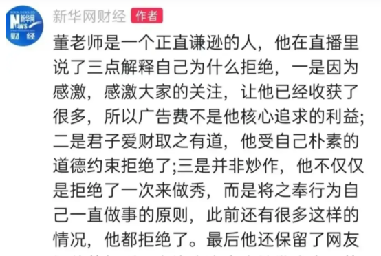 同一時(shí)期,董宇輝直播再次回應(yīng)不收坑位費(fèi)時(shí)提到:“我要真想掙錢呢也不難,我前一段時(shí)間還收到了一個(gè)人給我發(fā)的,如果我愿意的話,我發(fā)一條視頻他給我1000萬呢。我到現(xiàn)在沒有接受他的這個(gè),但我是覺得這沒有必要,不能只爭(zhēng)多論少,只論錢我都看不起我自己,咱又不是干兩三天就不干了,要想掙錢早就掙了,早就財(cái)富自由了!