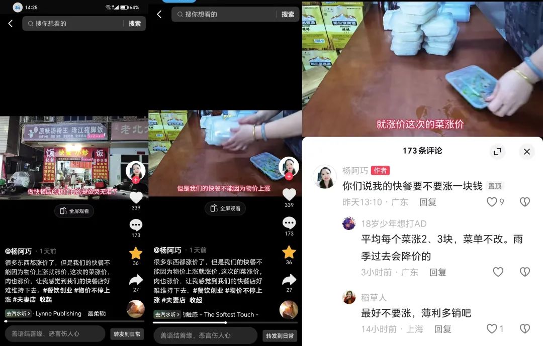 記者看到楊阿巧的視頻下,她自己寫了一條評(píng)論“你們說我的快餐要不要漲一塊錢”。