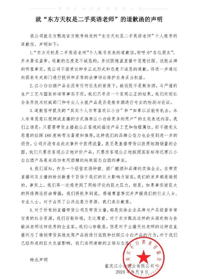 對(duì)此,江小白迅速發(fā)表官方聲明,給出強(qiáng)有力的反擊,強(qiáng)調(diào)其所有白酒產(chǎn)品,均采用純糧固態(tài)發(fā)酵釀造工藝,釀造原料只有水和高粱,產(chǎn)品執(zhí)行標(biāo)準(zhǔn)為代號(hào)GB/T26761(優(yōu)級(jí))的小曲固態(tài)法白酒國(guó)標(biāo);并表示已向相關(guān)主管部門(mén)進(jìn)行投訴,同時(shí)要求東方甄選就此事公開(kāi)道歉并消除影響,將保留進(jìn)一步追究東方甄選以及主播天權(quán)法律責(zé)任的權(quán)利。