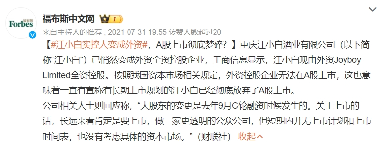 不過(guò),早在2021年江小白控股股東變更為港資公司JoyboyLimited,被業(yè)內(nèi)解讀為江小白在為上市做鋪墊。當(dāng)時(shí),江小白方面對(duì)此表示,創(chuàng)辦Joyboy Limited,是江小白基于公司中長(zhǎng)期戰(zhàn)略以及相應(yīng)的資本策略進(jìn)行的安排;此做法的確是很多已在香港上市的大陸企業(yè)較常規(guī)的結(jié)構(gòu),但短期內(nèi)江小白還沒(méi)有上市的具體時(shí)間表和相關(guān)規(guī)劃。