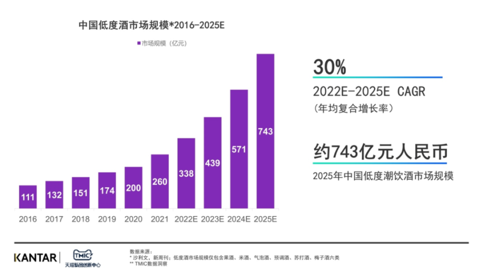 據(jù)TMIC&凱度發(fā)布的統(tǒng)計(jì)數(shù)據(jù)顯示,中國(guó)低度酒市場(chǎng)規(guī)模預(yù)計(jì)2025年預(yù)計(jì)將超過(guò)700億元。但低度酒包含了大量細(xì)分品類,例如預(yù)調(diào)雞尾酒、果酒、蘇打酒、梅酒、米酒等十多個(gè)細(xì)分市場(chǎng);分散下來(lái),每個(gè)細(xì)分市場(chǎng)的份額可能無(wú)法盡如人意。以此看來(lái),銷售突破10億元的“梅見(jiàn)”還能保持高速增長(zhǎng)多久?