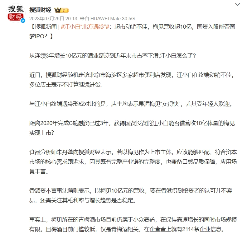 在江小白品牌聲勢(shì)減弱的背景下,有業(yè)內(nèi)人士指出若以梅見(jiàn)作為上市主體,或許能夠匹配、符合資本市場(chǎng)的核心需求跟訴求,因其既有完整產(chǎn)業(yè)鏈的完整度,也兼?zhèn)淇诟衅焚|(zhì)保障,應(yīng)用場(chǎng)景豐富。