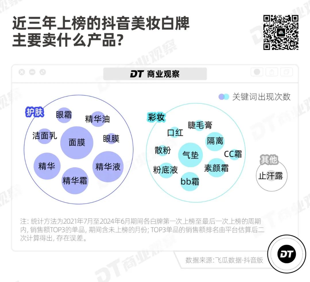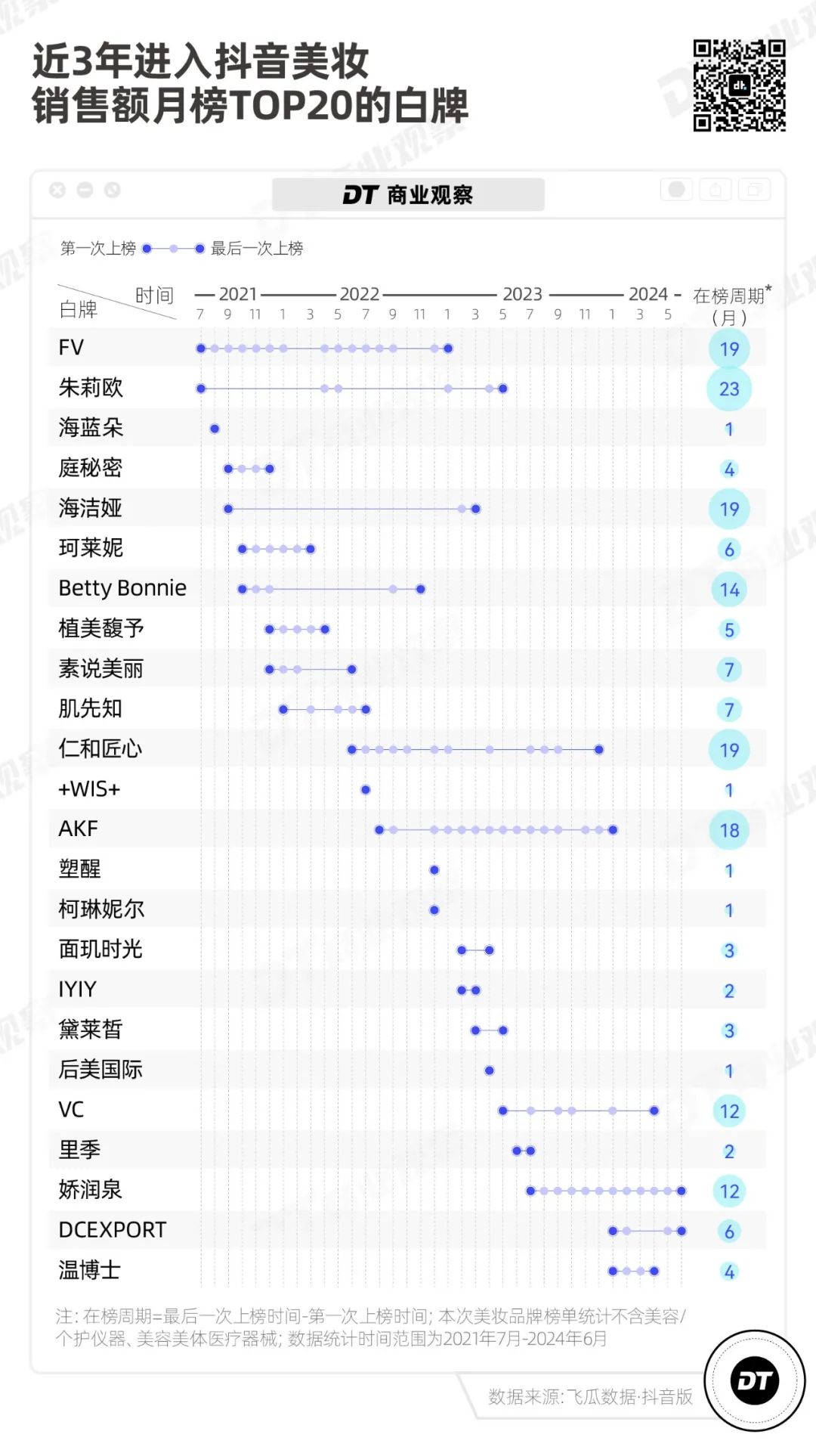 《DT商業(yè)觀察》統(tǒng)計(jì)了近三年(2021年7月-2024年6月)的抖音美妝月銷(xiāo)售額榜,發(fā)現(xiàn)曾經(jīng)沖進(jìn)榜單TOP 20的白牌有24個(gè)。品牌則有77個(gè),是白牌的3倍多。