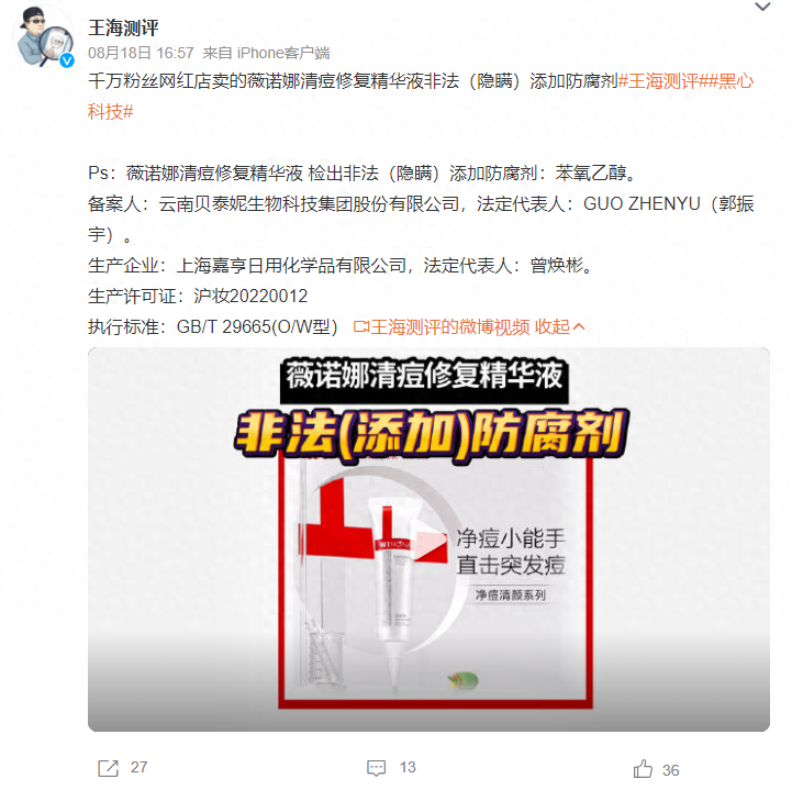 8月18日,賬號(hào)“王海測(cè)評(píng)”發(fā)布視頻,稱千萬(wàn)粉絲網(wǎng)紅店賣的薇諾娜清痘修復(fù)精華液非法(隱瞞)添加防腐劑。