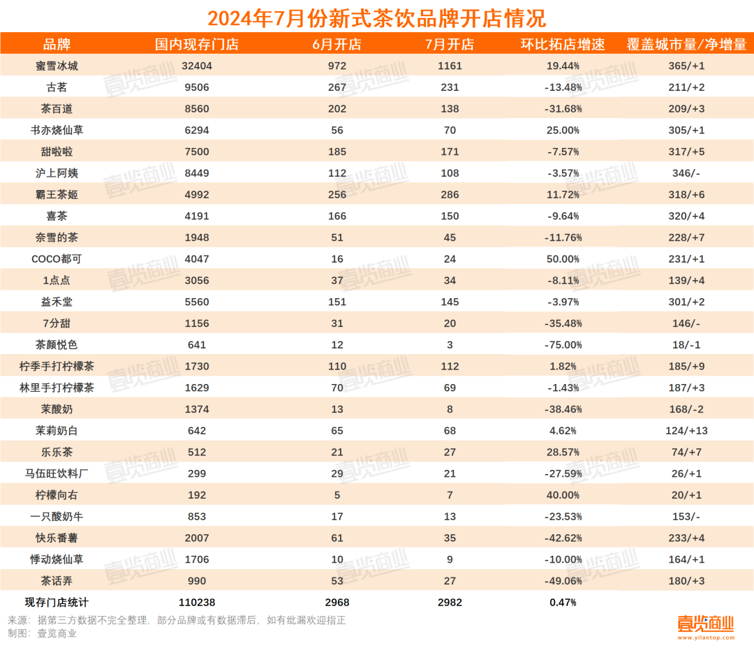 7月,壹覽商業(yè)長期跟蹤的25家新茶飲連鎖品牌新開門店數(shù)量與上月相比增加24家,新開門店總量環(huán)比增長0.47%,幾乎持平。