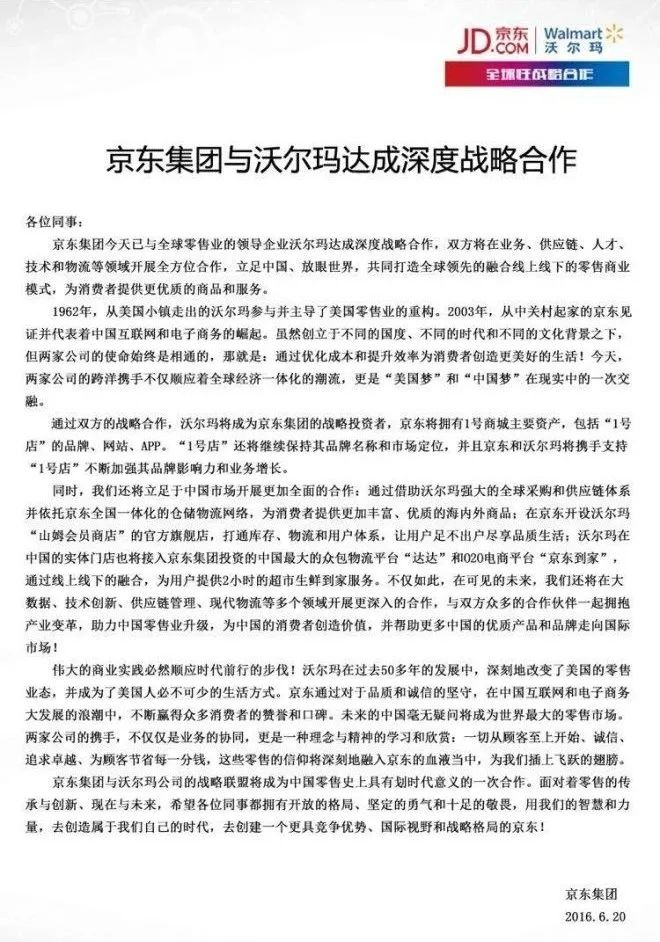 根據(jù)雙方當(dāng)時(shí)達(dá)成的協(xié)議,沃爾瑪將獲得京東新發(fā)行的144952250股A類(lèi)普通股。交易完成后,沃爾瑪將持有京東約5%的股份,按照當(dāng)時(shí)京東股價(jià)估算,估值約達(dá)15億美元。