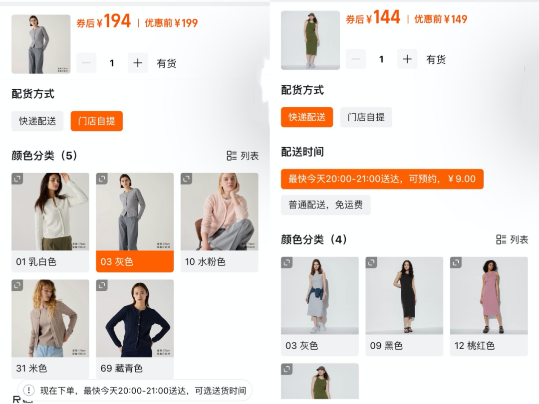 而本次和淘寶小時(shí)達(dá)合作,則是官方親自下場(chǎng),在淘寶優(yōu)衣庫(kù)店鋪下單后,可選擇快遞配送(配送費(fèi)9元)及門店自提兩種方式,配送時(shí)間在 2 至 3 個(gè)小時(shí)。