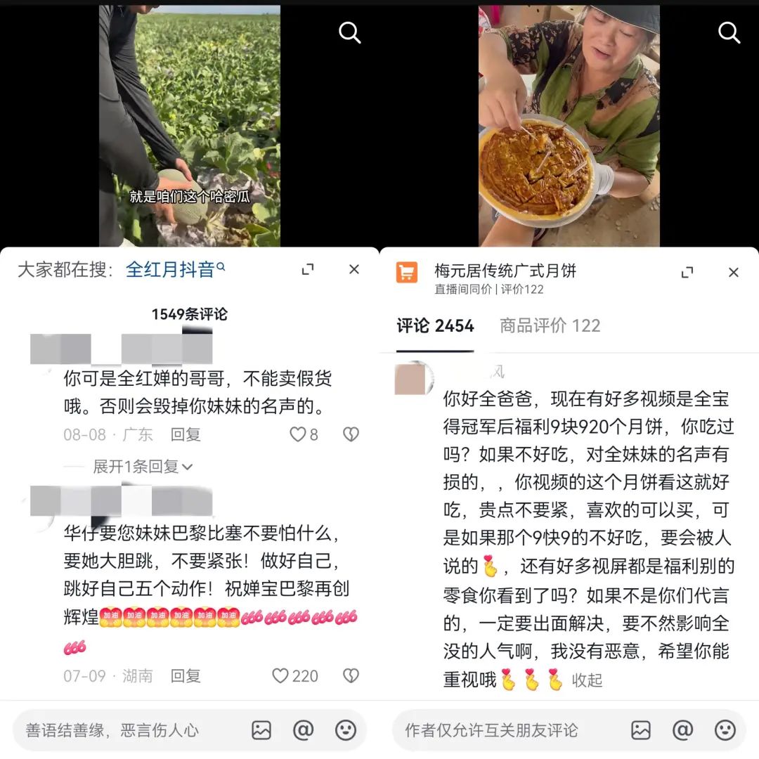 就像帶貨的全紅蟬哥哥,雖然并未消耗過(guò)全紅蟬的形象,但涌入其直播間的網(wǎng)友,依舊是在為“全紅蟬”買(mǎi)單,一旦出現(xiàn)品控、質(zhì)量或是售后的問(wèn)題,這波流量就會(huì)反噬直播間,在他的評(píng)論區(qū)中,也有不少網(wǎng)友留下“千萬(wàn)不能帶劣質(zhì)產(chǎn)品”“要嚴(yán)格篩選廠(chǎng)家”的囑托。