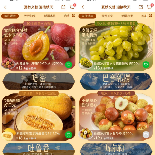 8月21日,叮咚買菜新疆水果節(jié)正式啟動(dòng),已經(jīng)陸續(xù)上架了冰川雪水蜜瓜、冰川雪水無(wú)核白葡萄、吊干杏、西梅、冰川雪水玻璃脆葡萄、甜心麻油桃等20余款新疆優(yōu)質(zhì)水果,未來也會(huì)持續(xù)上架應(yīng)季果品。全年總計(jì)70余款。