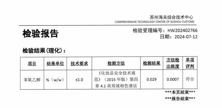 此外,貝泰妮還提供了由蘇州海關(guān)出具的薇諾娜清痘修復(fù)精華液的安全性檢測報告以及苯氧乙醇檢測報告,報告標(biāo)注日期分別為2024年5月30日、7月12日。根據(jù)苯氧乙醇檢測報告顯示,薇諾娜清痘修復(fù)精華液苯氧乙醇的檢測結(jié)果為0.029%。