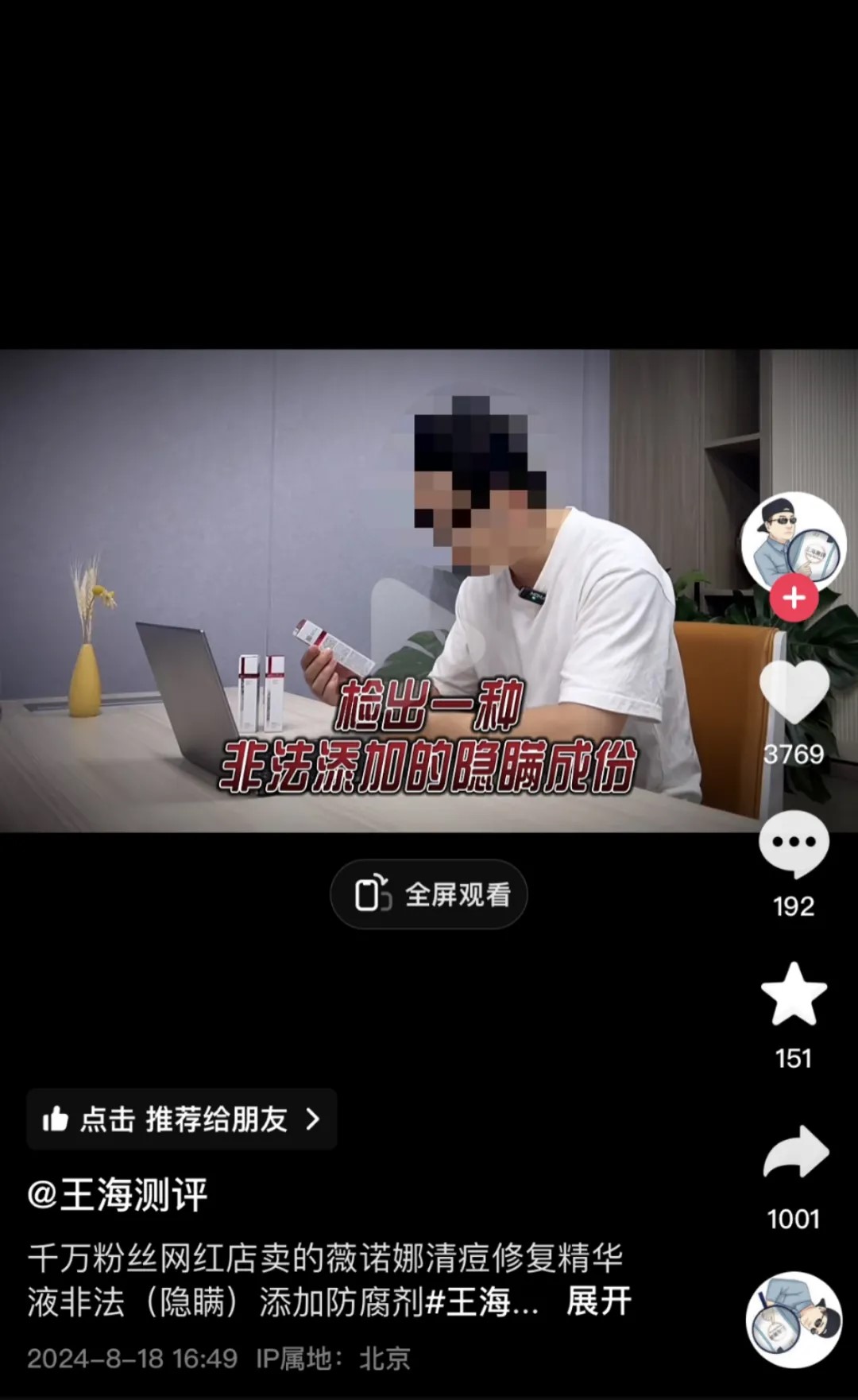 “王海測評”在視頻中還表示,“非法添加的防腐劑屬于未經(jīng)備案和未在成分表中標(biāo)注的隱瞞成分,存在潛在風(fēng)險,建議買到的消費者請盡快停止使用,并向廠商所在地市場局投訴舉報,最低可要求退一賠三,起步價500元!苯刂涟l(fā)稿前,該視頻獲贊數(shù)超3800,并有近兩百條評論與超千人轉(zhuǎn)發(fā)。