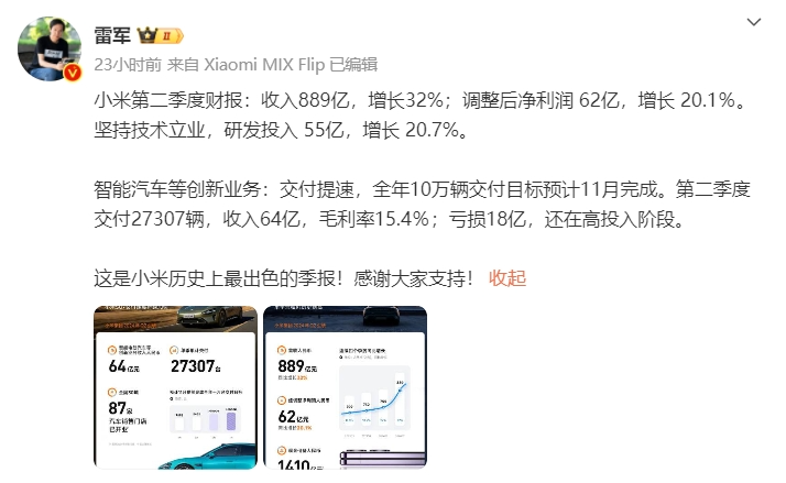 “這是小米歷史上最出色的季報(bào)!感謝大家支持!”在小米發(fā)布了2024年第二季度財(cái)報(bào)數(shù)據(jù)后,雷軍在微博上發(fā)布了這樣一段話。