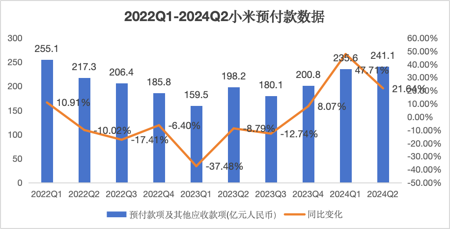 從2023年第四季度開(kāi)始,小米預(yù)付款的同比增幅比起2022、2023年的水平大幅拉升,這也和小米SU7上市與交付時(shí)間呼應(yīng)。