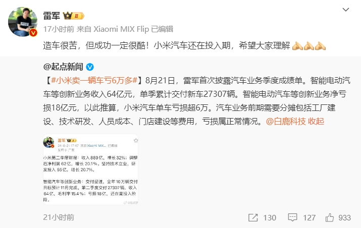 在8月22日的直播中,雷軍表示,“每臺(tái)車虧了6萬(wàn)多那個(gè)熱搜,算的既對(duì)也不對(duì)。剛剛才開(kāi)始,等到了一定規(guī)模,相信很容易打平。大家不用替我們焦慮。做車確實(shí)是挺難的,有人覺(jué)得我們虧得太多,我個(gè)人覺(jué)得還好,其實(shí)是份非常不錯(cuò)的財(cái)報(bào)!