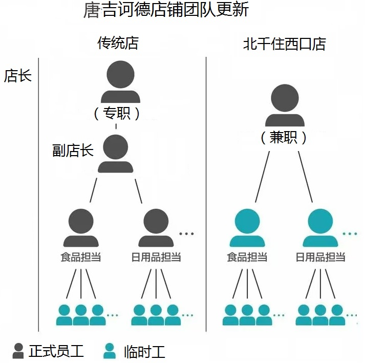 唐吉訶德最近的創(chuàng)新是臨時工為中心的店鋪運營模式。減少正式員工成本,取消一店一個店長、一個副店長、多個品類經(jīng)理的正式工設(shè)置,改為只有一名正式的兼職店長,其它崗位均是臨時工。