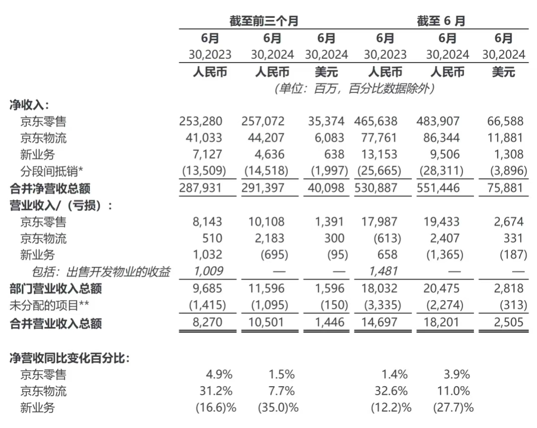 除了新業(yè)務(wù)出現(xiàn)下滑外,京東零售與京東物流均實(shí)現(xiàn)了小幅增長(zhǎng)。