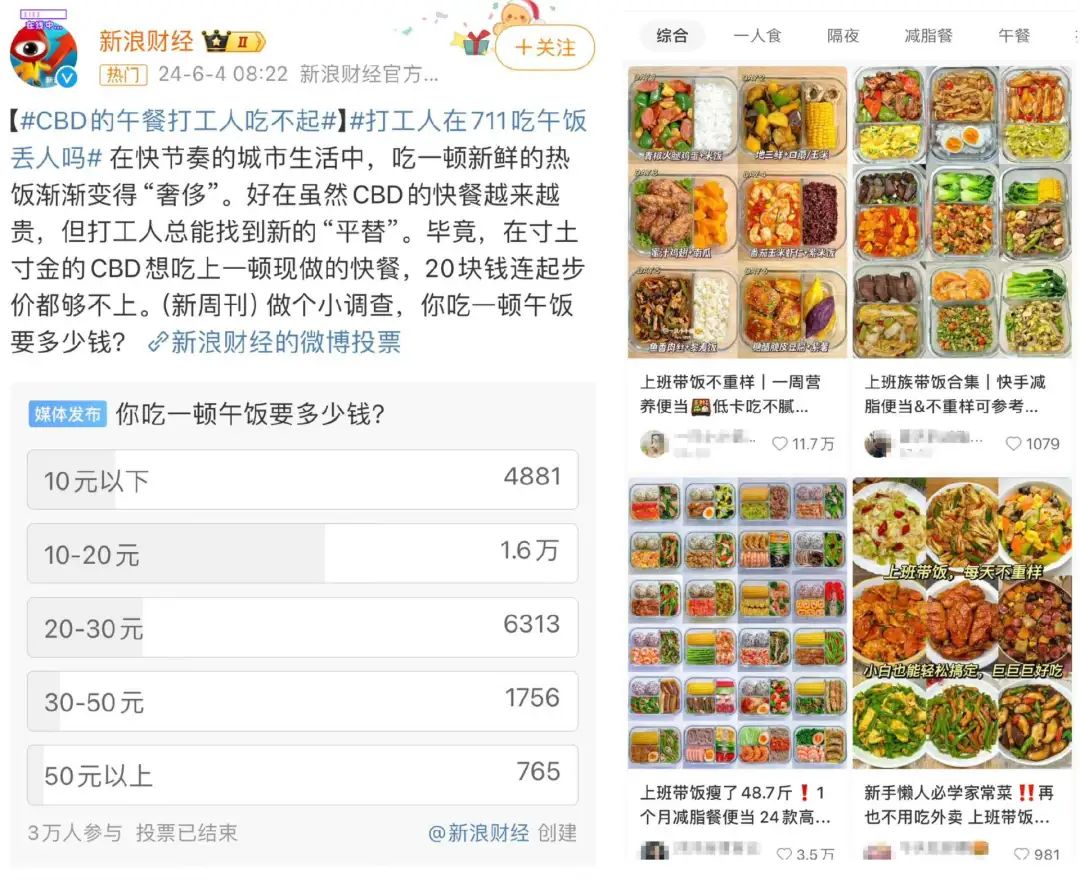 前段時間,#CBD的午餐打工人吃不起#登上熱搜,直擊一線城市CBD打工人的就餐問題,引發(fā)熱議。由新浪財經(jīng)發(fā)起投票“你吃一頓午飯要多少錢?”,共有3萬人參與,其中選擇“10元以下”的有4881票,而10-20元則高達(dá)1.6萬票。兩者票數(shù)相加,也就是說選擇“20元以下”的消費者占到了將近70%。