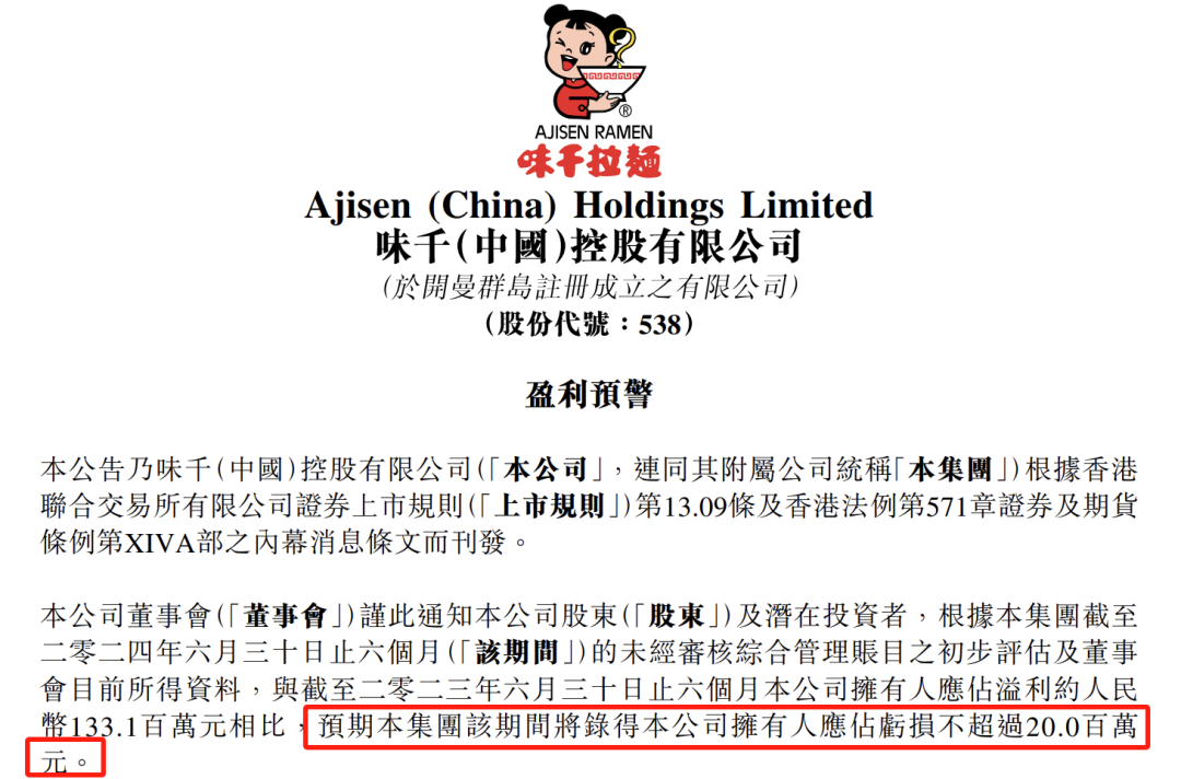 首當(dāng)其沖的是“高端面館鼻祖”味千拉面。在前不久公開的上半年財報數(shù)據(jù)中,味千拉面再度“由盈轉(zhuǎn)虧”,預(yù)計今年上半年凈虧損不超過2000萬元。受此消息影響,其股價可謂是“斷崖式下跌”,一度跌破22%。