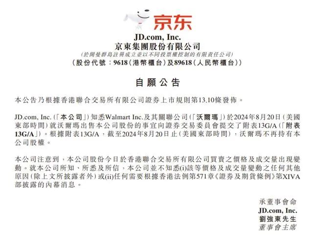 8月21日,京東集團(tuán)公告稱(chēng),本公司知悉Walmart Inc.及其關(guān)聯(lián)公司沃爾瑪于美國(guó)東部時(shí)間8月20日就沃爾瑪出售本公司股份的事宜向證券交易委員會(huì)提交了附表。根據(jù)附表,沃爾瑪不再持有本公司股權(quán)。