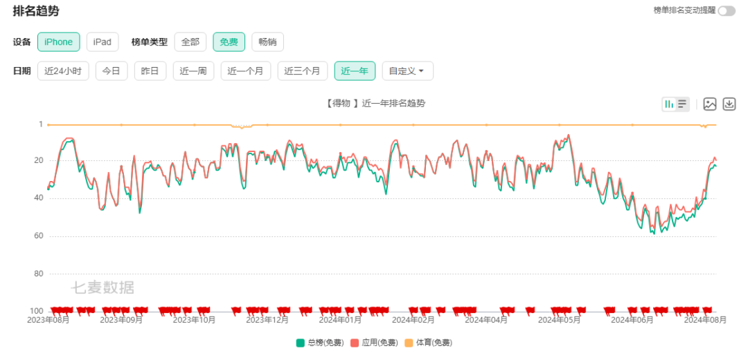 除內(nèi)容營(yíng)銷(xiāo)外,近一年得物長(zhǎng)期霸榜App Store體育榜TOP1,并維持免費(fèi)榜和總榜前50?紤]到近些年來(lái)App Store打榜和維持榜單費(fèi)用水漲船高,App Store獲客費(fèi)用對(duì)得物來(lái)說(shuō)也是一筆不小的開(kāi)支。