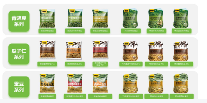 此外,鹽津鋪?zhàn)釉诿鎸?duì)市場(chǎng)變化和品牌競(jìng)爭(zhēng)中,采取了一系列戰(zhàn)略調(diào)整尋求新的增長(zhǎng)點(diǎn)。尤其是在堅(jiān)果果干等新品的第三增長(zhǎng)曲線上,鹽津鋪?zhàn)尤鎸?duì)標(biāo)甘源食品,將目光投向了甘源食品的青豌豆、瓜子仁、蠶豆老三樣。