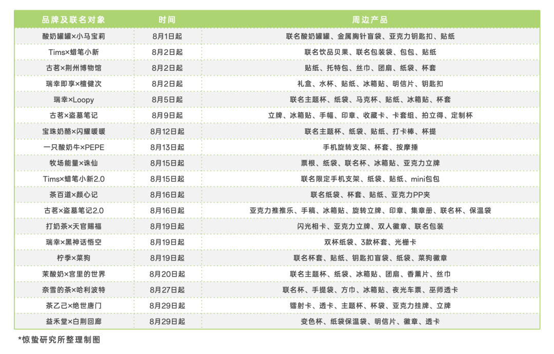 這一群體最看中什么?自然是印著角色的包裝袋、角色貼紙和立牌,而“售罄”更是成為聯(lián)名中的常見現(xiàn)象。驚蟄研究所在整理部分茶飲品牌8月的聯(lián)名活動(dòng)時(shí)發(fā)現(xiàn),市面上聯(lián)名周邊已經(jīng)不是過去“疊加logo”的排列組合,而是以主題杯、杯套、亞克力板和明信片為主的“周邊大禮包”,搭配設(shè)置聯(lián)名主題門店。