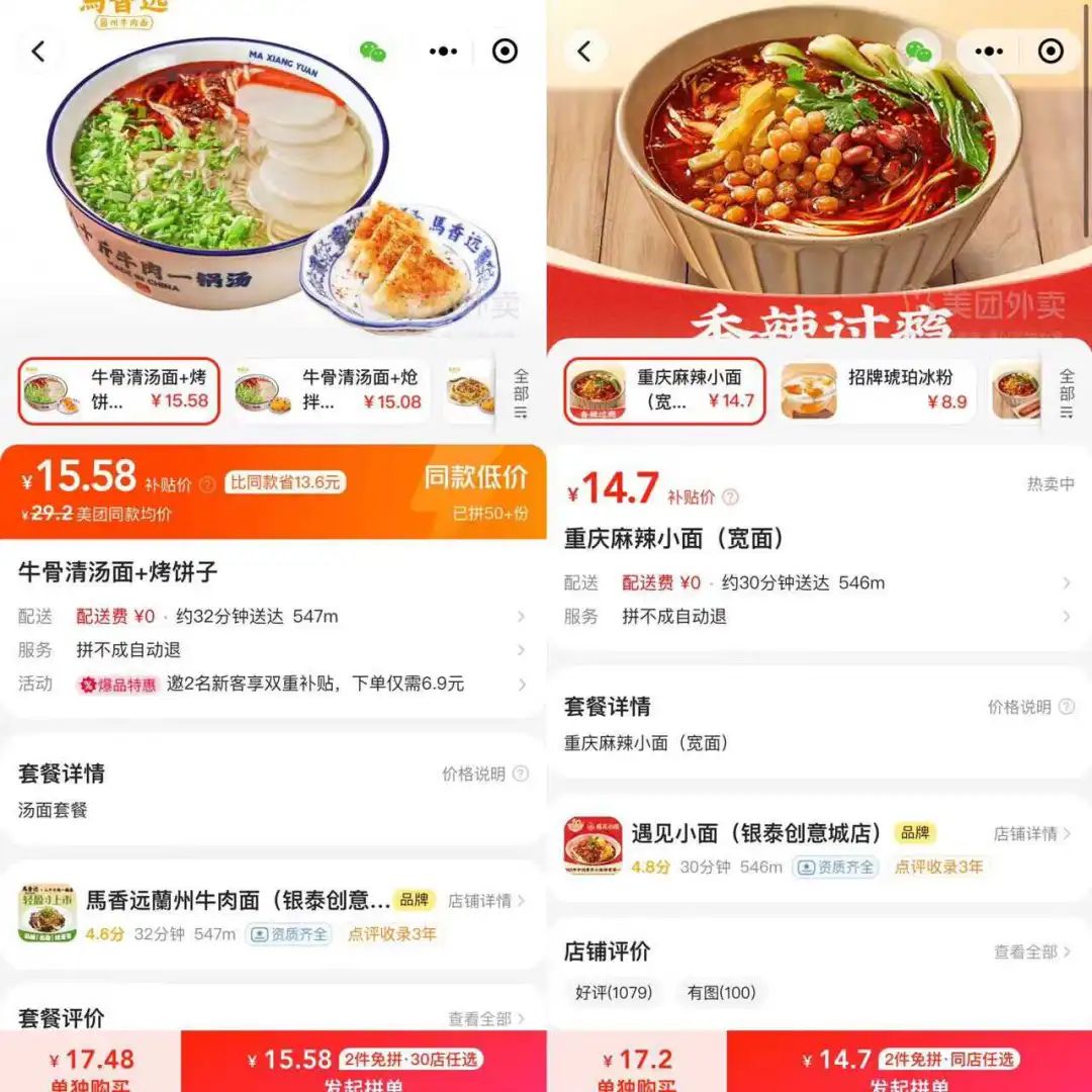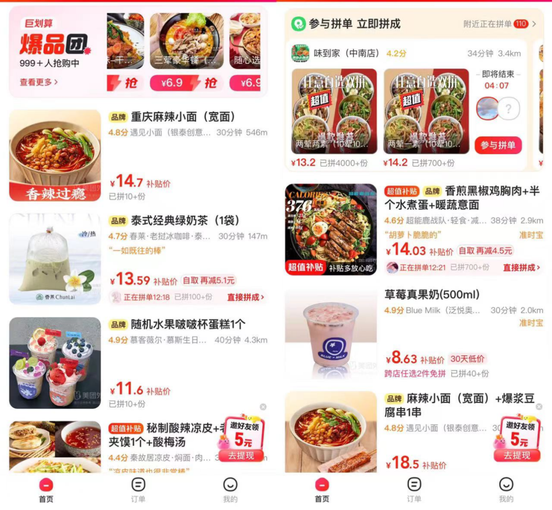 花6.4元能吃一份羊肉粉,花5.5元能喝一杯爺爺不泡茶的咸寧桂花,10.4元能吃上一份油潑面還能加個鹵蛋……這是餐觀局瀏覽的武漢拼好飯“到店自取”的真實價格,而且還不是新用戶福利。