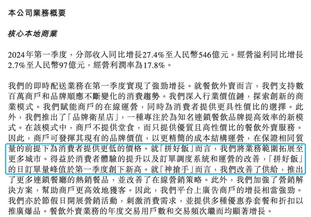 美團在2024年第一季度的財報中,提及拼好飯:“就拼好飯而言,我們將業(yè)務(wù)范圍拓展至更多城市,拼好飯日訂單量峰值于第一季度創(chuàng)下新高!倍鴵(jù)晚點LatePost報道,美團外賣的“拼好飯”今年一季度日均單量接近500萬單。