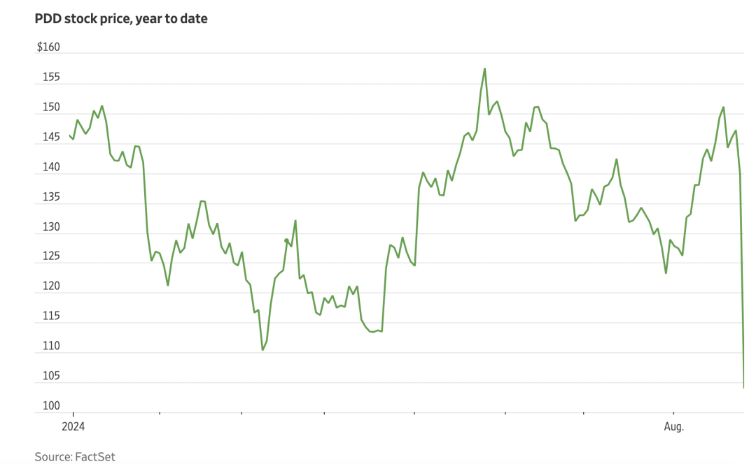 8月26日,公布完二季度財(cái)報(bào)的中概之光拼多多,盤中跌幅一度超30%,創(chuàng)自2018年上市以來的最大跌幅。