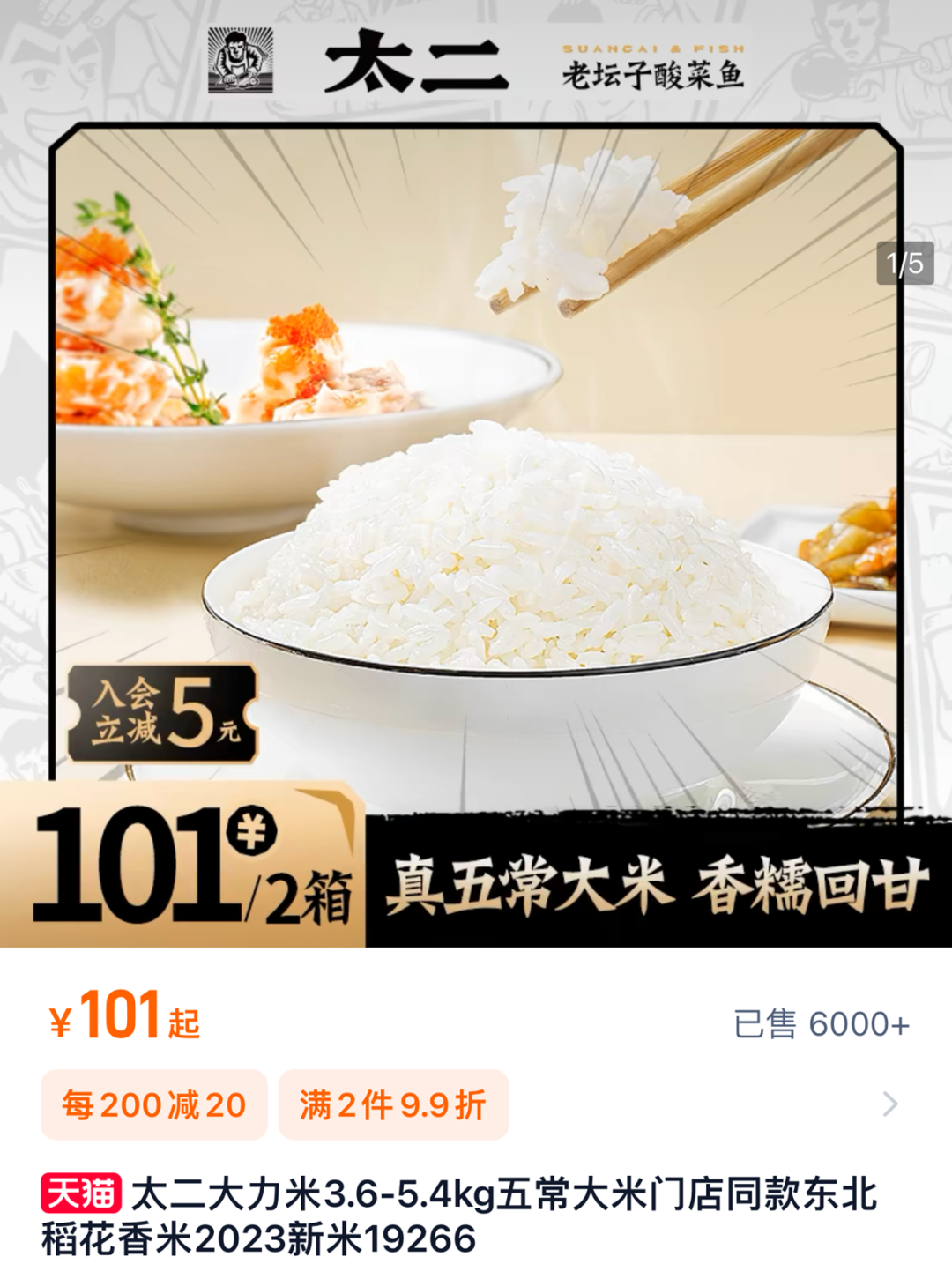 在天貓太二官方旗艦店,太二酸菜魚門店同款大米為“太二大力米”,推介語強(qiáng)調(diào)這款米“吃飽有勁,生活有力”,凸顯“來自五常大米核心產(chǎn)區(qū)”“在家吃門店同款”。
