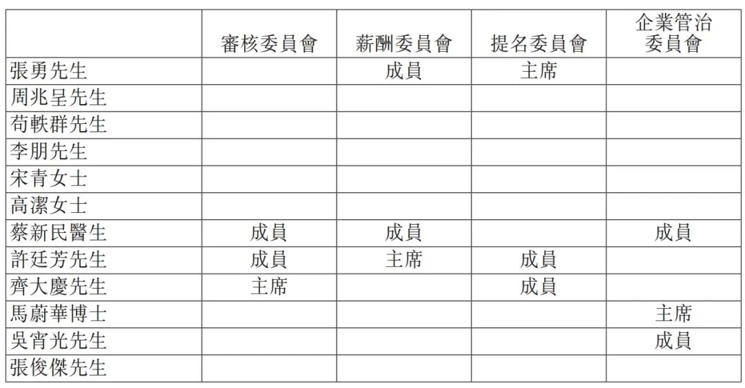 海底撈董事會旗下有四個董事委員會,馬蔚華與吳宵光分別擔(dān)任企業(yè)管治委員會主席、成員,其他獨(dú)立非執(zhí)行董事,亦分別擔(dān)任審核委員會、薪酬委員會、提名委員會職務(wù)。只有張俊杰,仍未具體掛職。