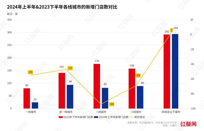 可以說(shuō)除了下沉市場(chǎng)仍在加速擴(kuò)張,茶百道在一線、新一線、二線及三線城市的門(mén)店擴(kuò)張速度全面放緩,尤其是一線城市,增幅大幅收窄,新增門(mén)店數(shù)較去年下半年減少了55家。