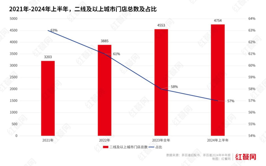 對(duì)于頭部茶飲品牌來(lái)說(shuō),逐漸完成對(duì)高線城市的滲透布局之后,增量空間已經(jīng)不大。比如茶百道,2021年、2022年、2023年、2024年上半年,其在二線及以上城市的門(mén)店數(shù)占比分別為63%、61%、58%、57%,呈現(xiàn)出逐年下降的趨勢(shì)。