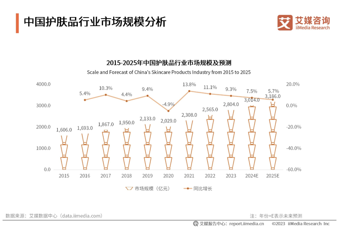 在細(xì)分賽道中,比如護(hù)膚領(lǐng)域,艾媒咨詢數(shù)據(jù)顯示,中國護(hù)膚品行業(yè)2023年市場規(guī)模為2804.0億元,同比增長9.3%。消費(fèi)者護(hù)膚意識日益增強(qiáng),護(hù)膚品消費(fèi)理念也在不斷更新,對保濕、滋潤、美白、防曬等基礎(chǔ)護(hù)膚需求持續(xù)增長,對抗衰老、防皺等進(jìn)階護(hù)膚需求也日益關(guān)注。
